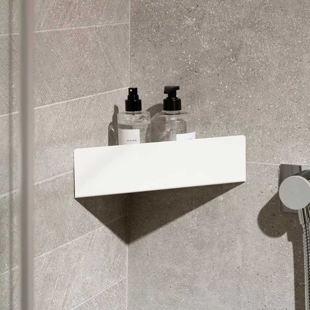 Кутова полиця монтується на стіну в кутку ванної кімнати, що дозволяє використовувати простір, який зазвичай залишається незайнятим. Полиця може мати один або кілька ярусів, що дозволяє розмістити на ній різні предмети, такі як шампуні, гелі для душу, мило, рушники, косметика та інші необхідні речі.