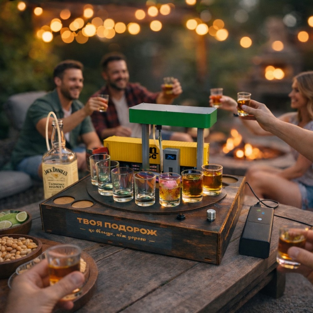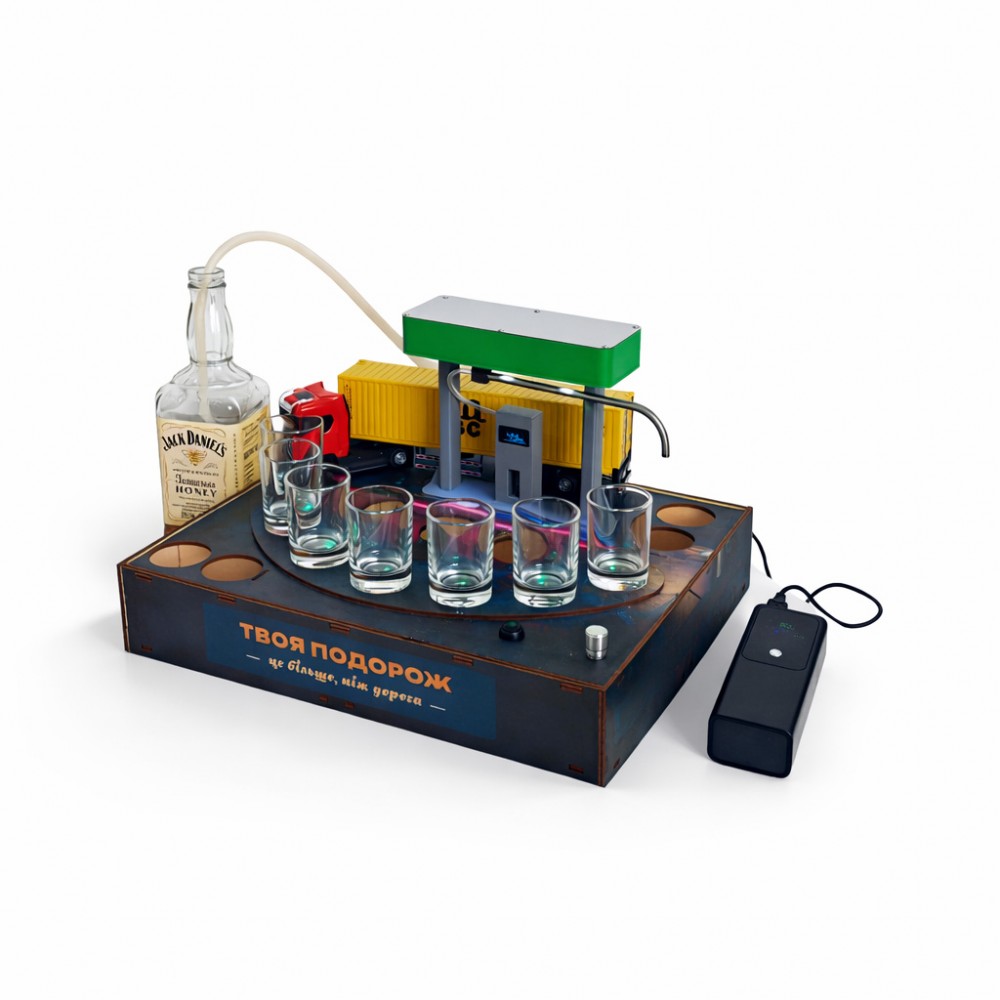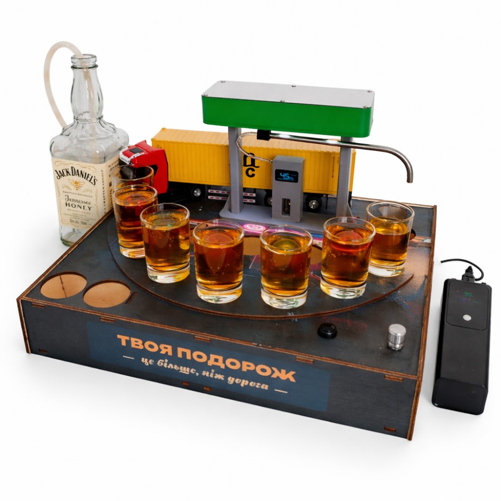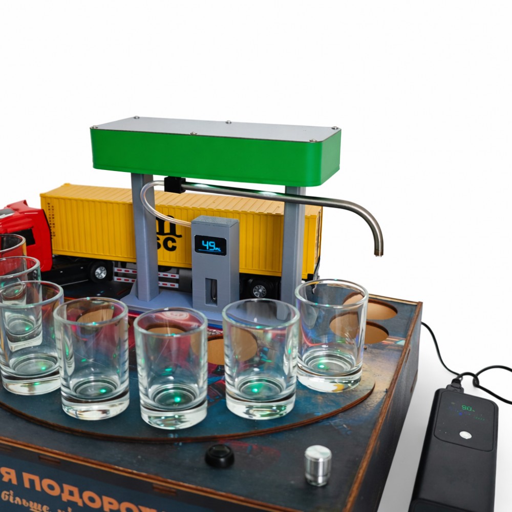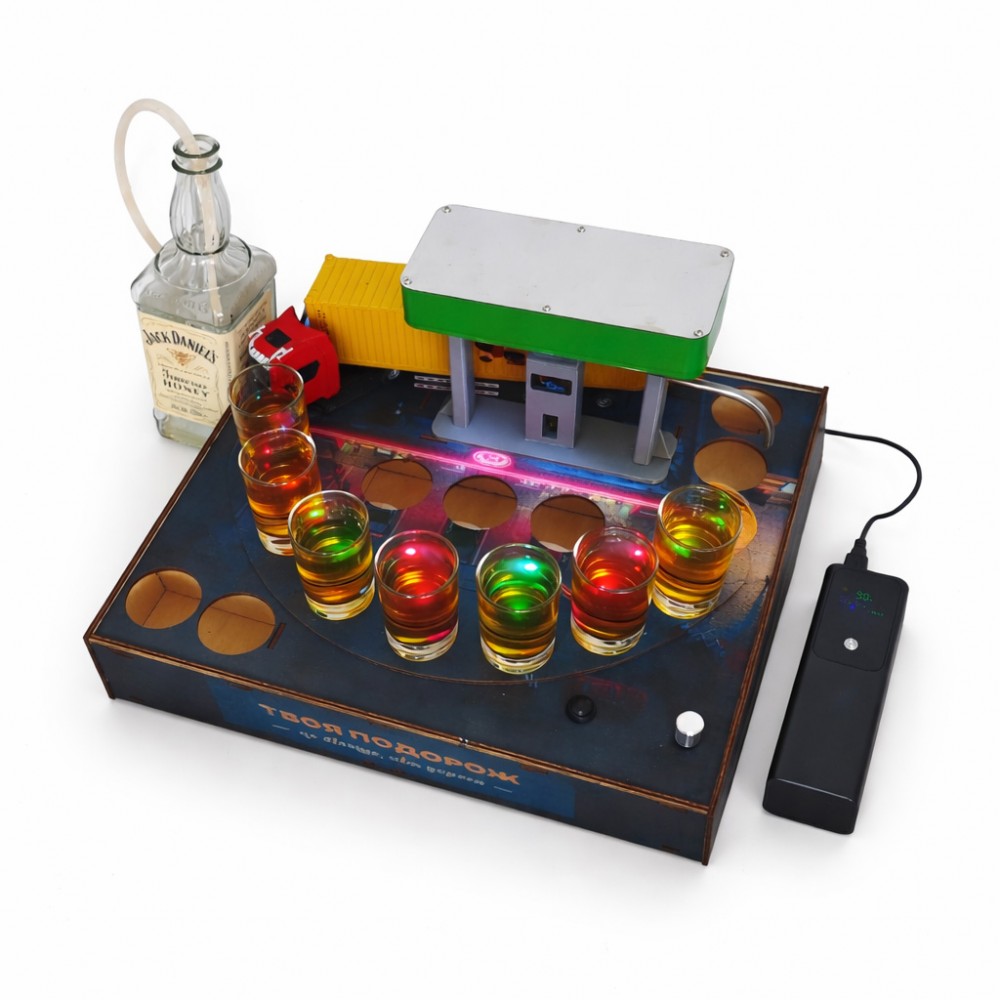 Алкогольный наливатор АЗС на 4 рюмки — это функциональный и эффектный барный аксессуар, который превращает процесс разлива алкоголя в настоящее шоу. Конструкция в виде автозаправочной станции позволяет равномерно наливать напиток сразу в четыре рюмки одним движением.