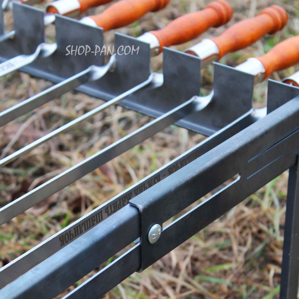 Шашлычница изготовлена из качественной стали, что обеспечивает ее прочность и долговечность. Жаровня рассчитана на 8 шампуров, что позволит приготовить шашлык для большой компании.